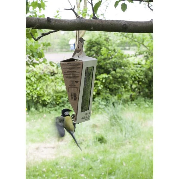 Kant en klare vogelvoedersilo gevuld met 230 gram zwarte zonnebloempitten. Deze driehoekige silo is gemaakt uit stevig recycleerbaar karton. Gewoon twee hoeken van het karton induwen, omhoog hangen en dan wachten tot de eerste meesjes komen smullen.