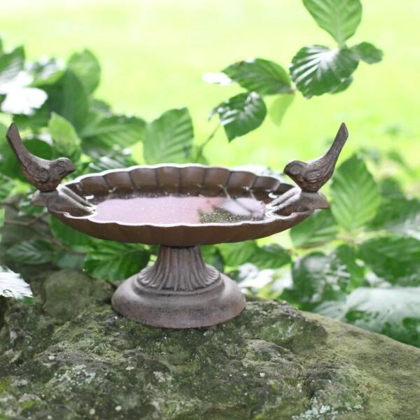 Dit mooie antiek roestbruine gietijzeren vogelbad vormt een attractief element in je tuin. Het vogelbad heeft een schelpmotief en twee schattige gietijzeren vogeltjes aan de rand van het bad.
