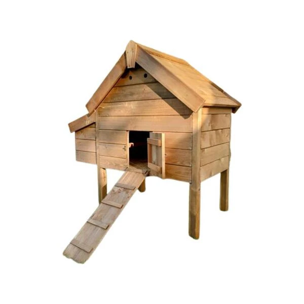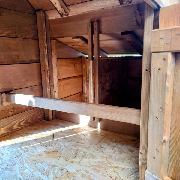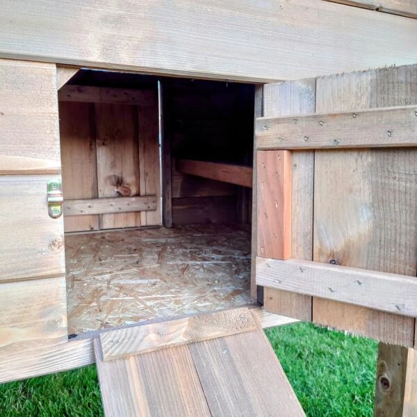 Deze kippenhokken staan op hoge poten en hebben een lange loopplank voor het gemak van de kippen. Het legnest is uitgerust met twee afgescheiden zones en kan zowel aan de linker- als rechterzijde worden gemonteerd, naar gelang jouw voorkeur. Zowel de bodem van het legnest als die van het hok bestaan uit houten OSB-platen. Daarnaast zijn er twee houten uitneembare zitstokken beschikbaar, waarop de kippen comfortabel kunnen rusten.