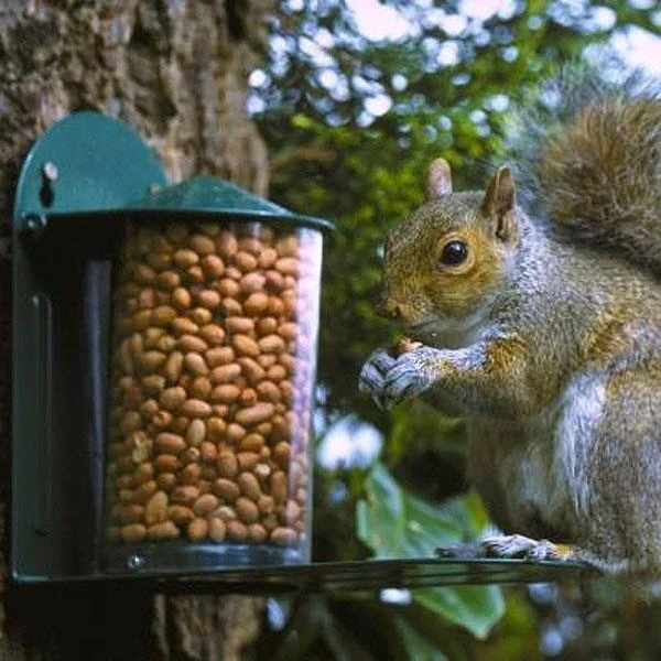 Hang het voederhuis niet te dicht tegen de andere voederplaatsen. Vul het huisje op met pinda’s, zonnebloepitten, tamme kastanjes, walnoten, hazelnoten, beukennootjes, havermout of met een voedermix uit ons gamma. De eekhoorn ziet het voedsel liggen achter het doorzichtig plexiglas en kan zelf het dekseltje opendoen om bij het voedsel te komen. Het deksel is zo gemaakt dat het nooit open kan blijven staan. Zo zal het voedsel nooit beschimmelen of nat worden door de regen.