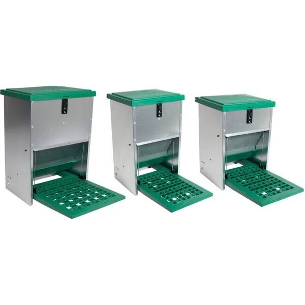 Een kwalitatieve en innovatieve trapbak voor het voederen van pluimvee. De kippen hebben enkel toegang tot het voeder wanneer ze op de trapplank van de voederbak stappen. Het gewicht van het pluimvee opent de klep onderin de trapbak waarna de kippen of fazanten kunnen eten. Als de dieren de trapplank verlaten, valt de klep opnieuw dicht zodat tuinvogels, wilde duiven of kleine knaagdieren geen toegang tot het voeder hebben.