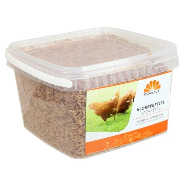 Trakteer jouw kippen op deze lekkere vlokreeftjes, ze zuller er dol op zijn! Vlokreeftjes zijn een uitstekende aanvulling op de dagelijkse behoefte aan dierlijke eiwitten die ze in hun natuurlijke omgeving in de vorm insecten en wormen verzamelen.