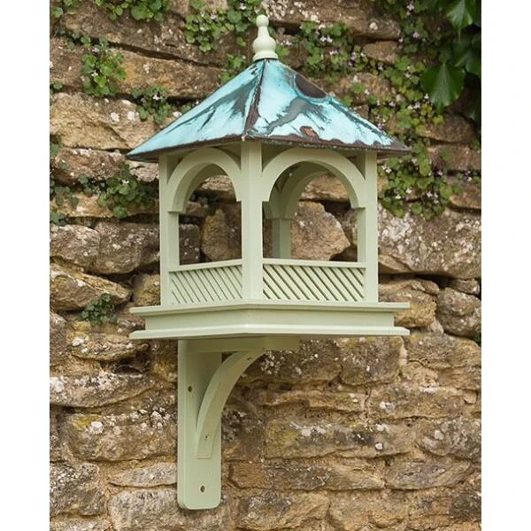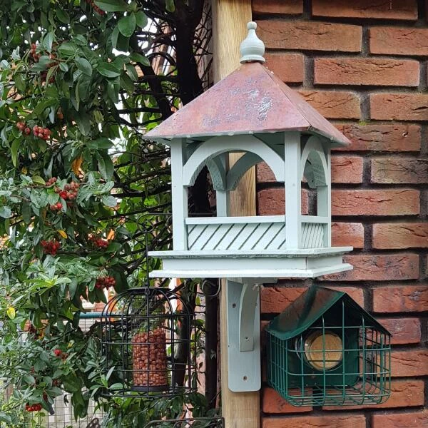 Deze mooie voedertafel is ideaal voor de kleinere soorten vogels in de tuin. Dit model wordt geleverd met een houten hoek, waardoor bevestiging aan de muur, schutting,… mogelijk is. Onder het dak is het voer beschut voor de regen, waardoor het langer goed blijft.
